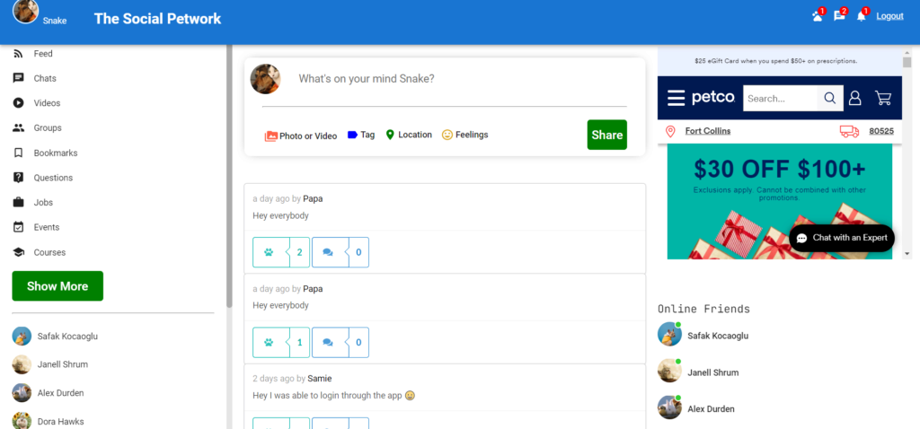 This project is a social media application for pets! It was designed with humor as the users will be the pet themselves. This app has the ability for a user to register/signup. Once the user is logged in they are directed to the feedpage. On the feedpage the user can see a timeline of other users posts. There the user can like a post from another user. A logged in user can create a new post. They have the ability to update that post as well as delete the post. We first built this project with a REST API and then converted the backend to use GraphQL queries and mutations.