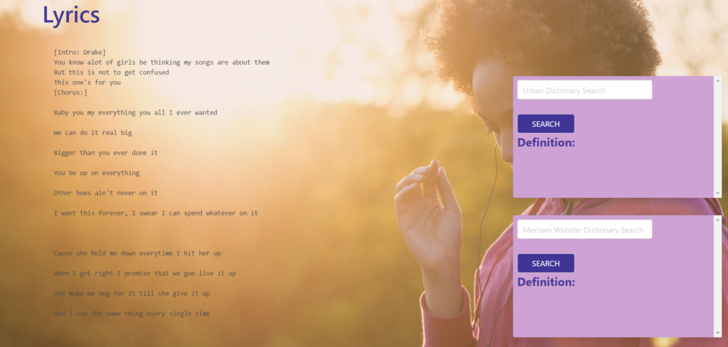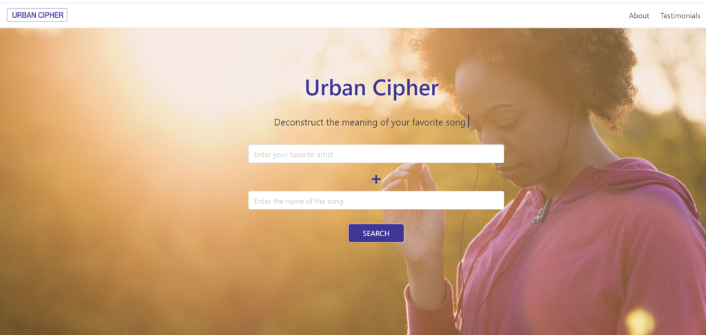 The user can start by entering an artist and Urban Cipher will generate that artists top 10 tracks to help find the users song, otherwise the user can enter the song of their choice press search and Urban Cipher will generate the lyrics of that song for you. One can use our Urban Dictionary to search for any lingo one wants to further their knowledge with our Webster or Urban dictionary search.